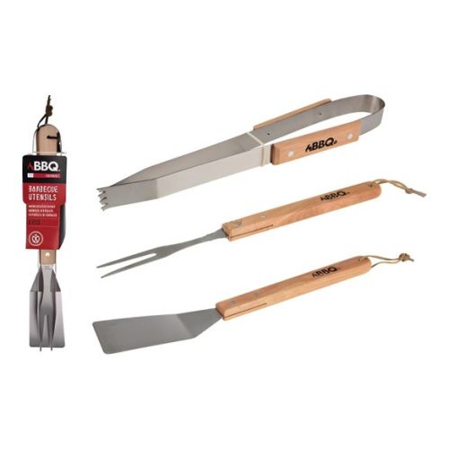 SET ACCESORIOS PARA BARBACOA. Compuesto de 1 pala , 1 pinza y 1 tenedor de 39,5 cm con mango de madera.