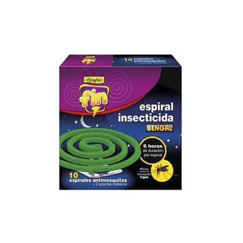 Las espirales FIN ofrecen una máxima eficacia insecticida contra mosquitos y otr os insectos voladores en ESPACIOS EXTERIORES como terrazas,jardines, campings, e tc. El producto actúa por difusión paulatina y constante del principio activo al quemarse la espiral por encendido de la misma.