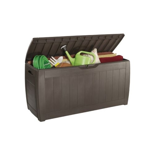 ARCÓN JARDIN HOLLYWOOD MARRÓN. Color: imitación Marrón. Paneles de polipropileno . Tapa con apertura fácil. Tipo de unión con sistema click.Cierre apto para cand ado. Protección UV. Medidas 117x45x57.5cm