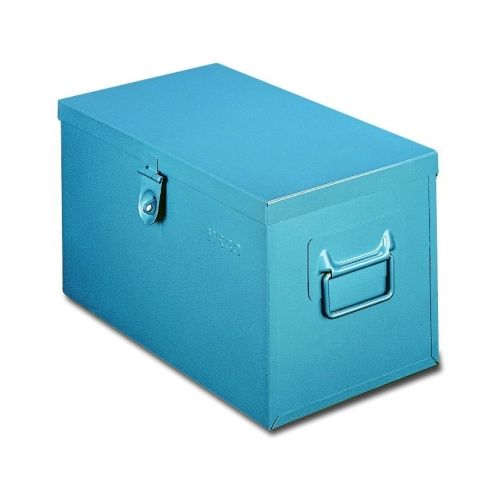 Arcón sin bandeja. Peso: 24,6 kg. Medidas: L565 x alto y ancho 330 mm. Refuerzo s y soportes bandeja. Opción cierre a candado. Armazón de chapa pulida. Soldado por resistencia, secado a estufa, previo desengrasado y fosfatado. Color azul ma ltelé. Asa ergonómica, varilla plegada Ø 8 mm 240 mm. Las tapas són abatibles co n tope de apertura a 90 .