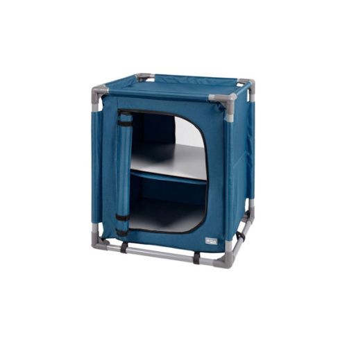 Armario desmontable Aktive Camping fabricado con estructura de acero color gris y tejido de poliéster 600D color azul, un material resistente y duradero, capaz de soportar la exposición a la intemperie sin desgastarse fácilmente. Cuenta con dos amplios compartimentos para organizar los utensilios de cocina, la vajilla o los alimentos que vayas a utilizar en los días de acampada. El armario tiene u na puerta de tela con cierre de cremallera que puede mantenerse abierta gracias a las dos tiras de velcros laterales. Incorpora un panel de rejilla en la parte trasera para ventilar y evitar la acumulación de humedad. Soporta un peso máximo de 25 kg y es fácil de montar y desmontar. Incluye una bolsa de almacenaje para guardar el mueble mientras no se esté utilizando y transportarlo con facilidad.