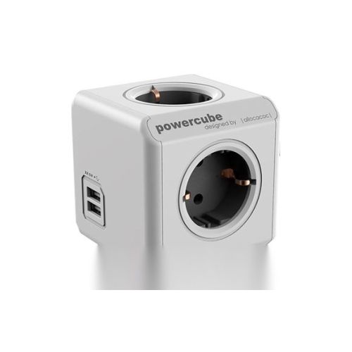 PowerCube 4T +2 USB, color gris, con 4 conexiones de enchufe y 2 conexiones USB. Output USB: 2 x 5 V (2100mA). Voltaje 100-240V; 13-16 A2. Longitud de cable: 1, 5-3 m. Sistema montaje y cable incluido.