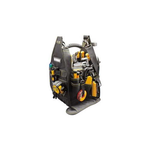 En nailon balístico 1680 D muy resistente a la abrasión. Parte inferior de goma, Correa de transporte y asa de plástico, 14 bolsillos exteriores, con correas de nylon, 3 soportes para correas, 8 bolsillos interiores con correas, Soporte par a cinta métrica, Soporte para 3 correas, Soporte interno de herramientas extraíb le con correas. Probado con más de 40 herramientas. Herramientas no incluidas.