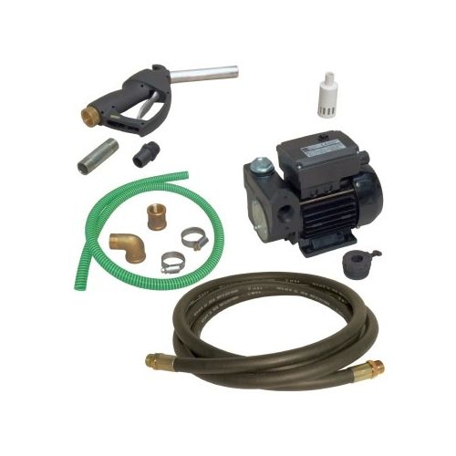 Bomba autoaspirante eléctrica para trasvase de gasóleo con accesorios. Caudal máximo: 55 litros / minuto. Presión: 2 bar. Protección IP-55. Con filtro, manguera de aspiración de 1,3m, mangueras de servicio de 3 m y pistola de servicio. Esta bomba viene equipada con todos los accesorios necesarios para armar y comenzar a trasvasar de inmediato.