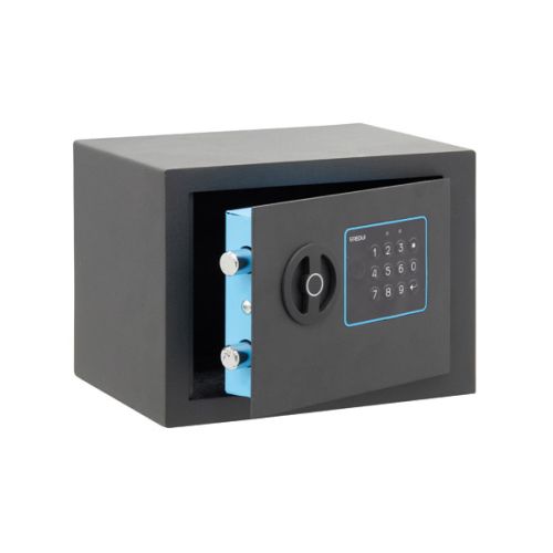 Caja fuerte BLUE de sobreponer en color grafito, con apertura mediante código el ectrónico y pomo. Dispone de 2 códigos de apertura de 3 a 8 dígitos y función má ster. Espesor frente 3 mm con corte láser, y cuerpo de 1,5 mm. Cierre mediante 2 bulones de 16 mm de diámetro. Llave de emergencia.