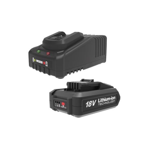 Cargador de batería 18 V WESCO, con indicador de capacidad de la batería. Apto t anto para baterías de 2 como de 4 Ah. Con orificios de montaje en pared.