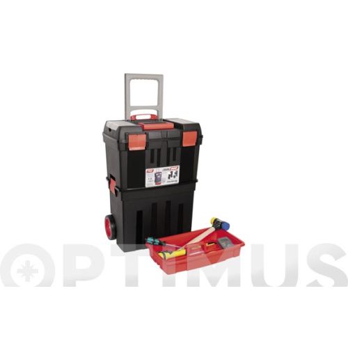 Trail Box nº 57. Medidas 470x290x630 mm. Contiene 1 bandeja. MaterialPP. Color n egro, bandeja roja. Con asa y ruedas que facilitan el transporte.