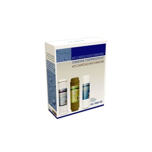 Kit Recambio 3 cartuchos osmosis. El carbón utilizado en los cartuchos son de cáscara de coco ( mucha más calidad ) mientras que algunos competidores utilizan carbón mineral ( más económico ). Ud. Caja: 10 Peso caja: 12.50 kg. Dimensiones: 44 x 42 x 29.