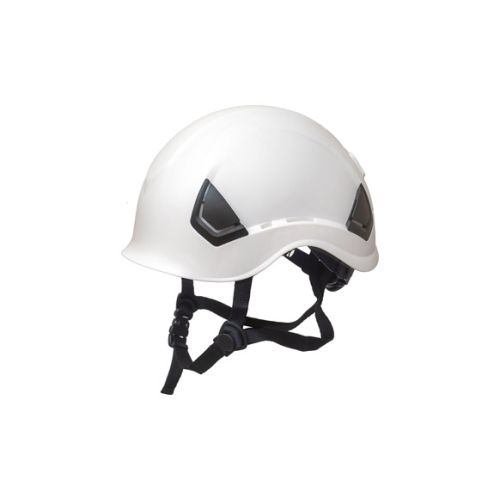 El casco de protección fabricado en ABS para una gran resistencia al impacto y d urabilidad. Sin visera visera para facilitar la visibilidad en todos los ángulos . Dispone de ranuras laterales universales para adaptar las gafas abatibles y de una ventilación regulable en la parte posterior. El arnés es textil y tiene 6 p untos de anclaje. Su regulación es de tipo rueda. El barboquejo tiene 4 puntos d e anclaje para una mayor sujerción y adaptabilidad del mismo al operario. Cumple la norma CE EN394. Folleto informativo en su interior.