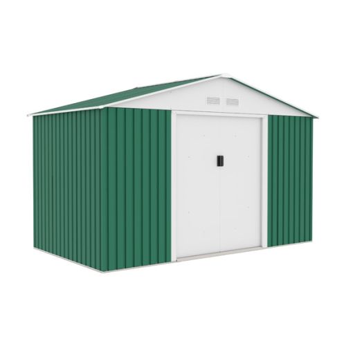CASETA METALICA DE JARDIN. Chapa galvanizada 0,25 mm. Superficie 7.74 m². Puerta deslizante de 130x157 cm. Medidas exteriores 321 (ancho) x 241 (profundo) x 205 cm (altura). Color verde. Sin suelo.