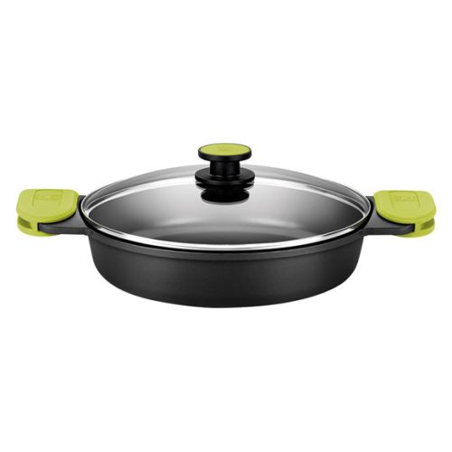 La cacerola baja Foodie de Bra es la solución perfecta para todo tipode cocinas, incluida la de inducción. Combina la mejor calidad con undiseño moderno y atemp oral en negro con toques de color en las asas. Está realizada en resistente alum inio fundido y tiene fondo con recubrimiento Teflón Profile de BRA Advanced de g ran espesor y efecto corazaque se traduce en una gran resistencia y durabilidad. Además, su granantiadherencia libre de PFOA permite cocinar con poco aceite par a unosplatos más saludables. El sistema de ahorro energético Full Inductionabsor be rápidamente el calor y lo distribuye de manera uniforme, paraque los alimento s se cocinen siempre de forma homogénea, ahorrando además tiempo y energía.