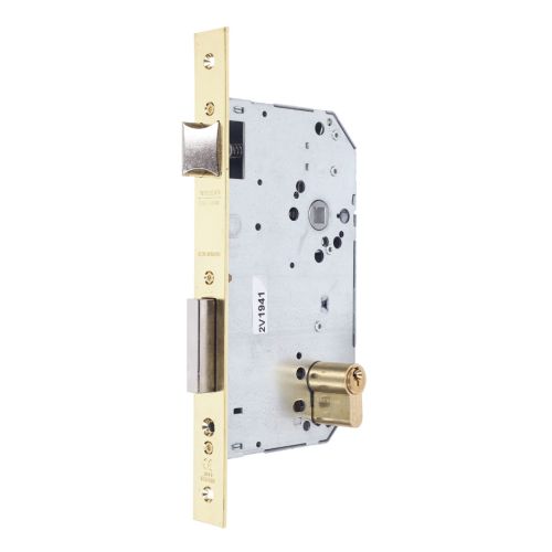 Cerradura de embutir para puertas de madera. Distancia entre ejejs de85 mm. Entr adas de 40/50/60/70 mm. Nueca de 8 mm. reversible. Cilindroeuroperfil TE-5 con l laves de acero niquelado. El cilindro acciona la palanca (2 vueltas) y el picapo rte. La nueva acciona el picaporte.