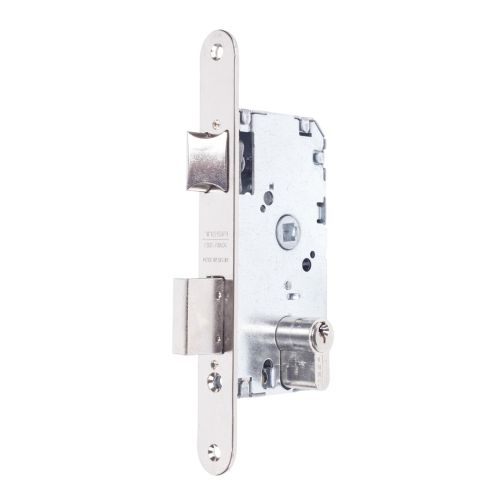 Cerradura de embutir en madera cilindro pera entrada de 40 mm palanca y resbalón canto redondo niquelada