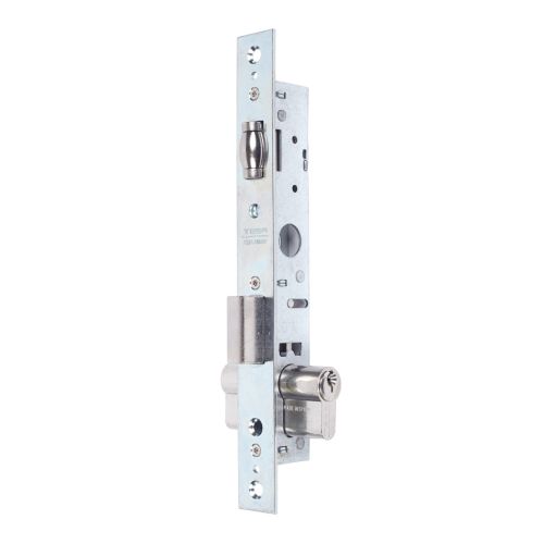 Cerradura de embutir para carpintería metálica. Entrada 13.5 mm. Picaporte de ro dillo. Palanca deslizante. Cilindro de 60 mm. No incluye cerradero ni escudo. Fr ente zincado