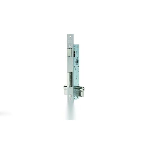 Cerradura de embutir para carpintería metálica. Entrada 25 mm. Picaporte reversi ble accionado por manilla y llave. Palanca deslizante. Cilindro de 60 mm. Frente y cerradero inox