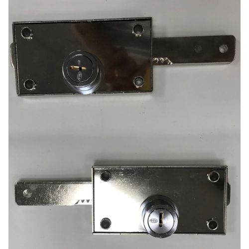 Conjunto de 2 cerraduras laterales para puerta persiana Ref. 584 con bombillo de seguridad de latón pulido Ø28. Para puertas enrollables y basculantes .Accesorios suministrados: escudo antitaladro cromado, y bolsa de accesorios.