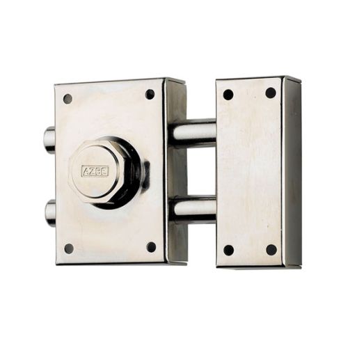 Cerrojo sobreponer. Cilindro exterior Ø 25 mm. Botón interior. Reversible. Caja de 90x60 mm. Niquelado