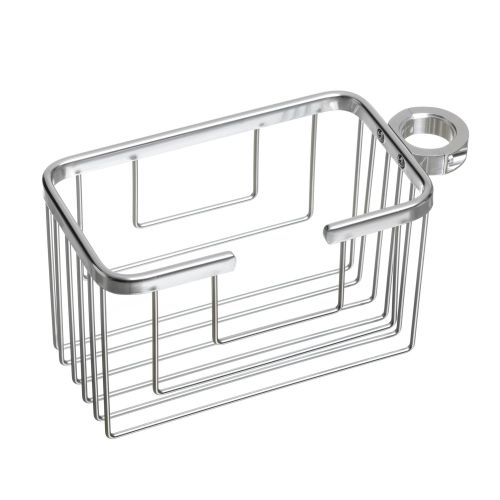 Cestillo diseñado para instalarse en barra de ducha mediante su colgador, compuesto por dos secciones en forma de "C" que se unen mediante tornillos, fabricado en aluminio acabado brillante, compatible con barras de ducha de base circular con un diámetro de entre 19 y 27 mm, para ello el cestillo dispone de 7 adaptadores de plástico que se colocan alrededor de la barra de ducha y en el interior de las dos "C".