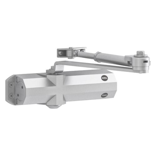 Cierrapuerta apto para puertas de mano izquierda o derecha, se monta en puertas con una anchura máxima de 1400 mm. y un peso de 120 Kg. resistente al fuego (CE) , posibilidad de ajustar la velocidad de cierre y golpe final, velocidad de cier re: Variable entre 180º - 15º, golpe final: Variable entre 15º -0º, fácil instal ación con la ayuda de una plantilla de perforación, testado hasta 500.000 ciclos de cierre y apertura para una máxima durabilidad, color plata.