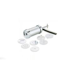 Cuerpo ABS y pies de acero cromado plegables con topes antideslizantes. Packaging: caja con colgador. Con 3 discos acero inox: rallado grueso, rallado medio y rebanador.