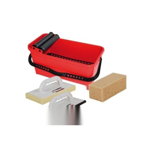 El kit se compone de 1 cubeta, 1 talocha con esponja 28x14x3 cm, 1 talocha de go ma, caucho 28x14x1 cm y 1 esponja 17x10x7 cm. Ideal para lalimpieza y rejuntado de todo tipo de superficies.