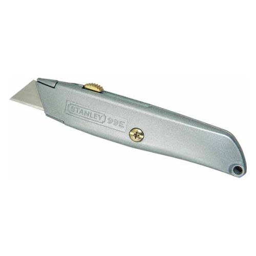 Cuchillo de hoja retráctil con cuerpo de zinc pintado de gris. El diseño de su parte superior mantiene segura la hoja en su posición. Resorte adicional interno de acero. Suministrado con 5 hojas en su interior.