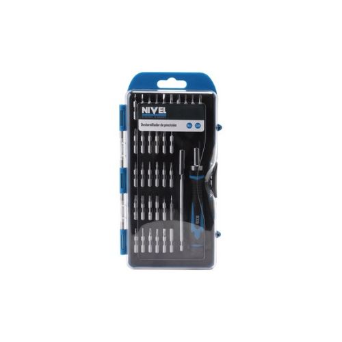 Estuche destornilladores de precisión juego de 36 uds acero cromo vanadio: 1 Bar ra extensión 115 mm, 1 mango destornillador precisión, 34 pz de brocas de pr ecision de 28 mm H4, 7 planas: 1.0-1.5- 2.0- 2.5- 3.0- 3.5- 4 5 philips: PH00 0 - PH00 - PH0 - PH1- PH1 3 pozidriv: #0, 2 X #1 11 Torx: 4-5-6-7-8-9-10, 2 x 35, 2 x 20 8 Hex: 0.7 - 0.9 -1.3 - 1.5 - 2 - 2.5 - 3 - 4 mm