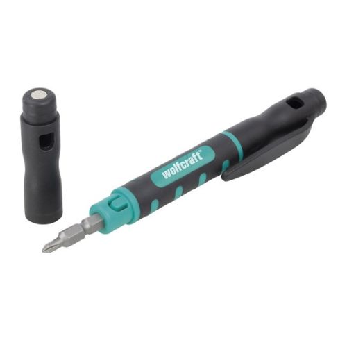 Micro destornillador con forma de bolígrafo con 4 puntas micro dobles para torni llos pequeños. - 2 puntas dobles reversibles para tornillos micro Phillips o c on cabeza ranurada (PH0 + SL 1.5/PH00 + SL 3.0), para un cambio de herramienta e n cuestión de segundos. - Práctica y compacta forma de bolígrafo para un manej o sencillo. - Capuchón con imán para un sencillo posicionamiento de los tornil los. - Clip para su fijación en el bolsillo de la camisa o el pantalón. Inst rucciones de uso: íLas personas que llevan marcapasos no deben colocar el microa tornillador cerca de su corazón!