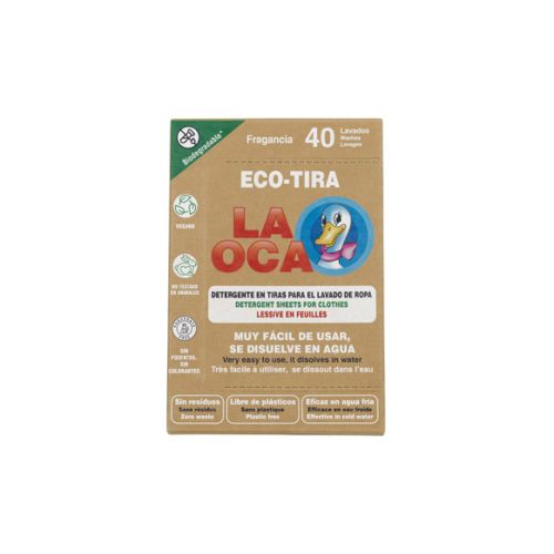 Detergente en tiras para el lavado de ropa. Se disuelve en agua. Sin fosfatos ni colorantes. Libre de plásticos. Sin residuos. Eficaz en agua fría.