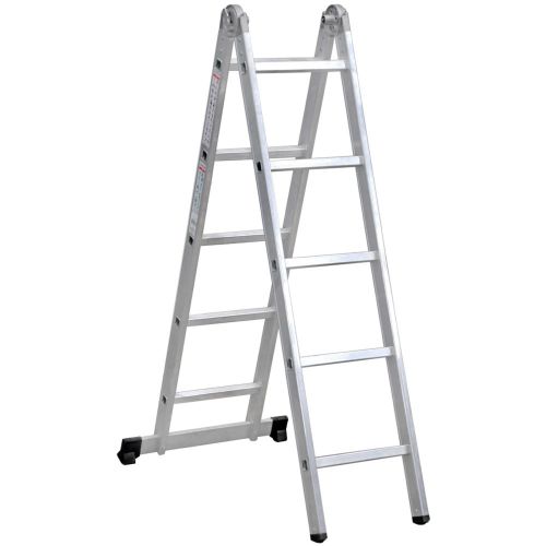 5+5 peldaños. Escalera de aluminio con dos posiciones de trabajo, extendida y ti jera. 3,5m extendida y 1,51 a tijera. Fabricada según norma UNE 131.