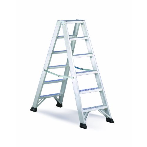 Escalera tijera de doble peldaño de 80 mm, ancho de 59 cm, altura total de 2,10 m y altura de trabajo de 3,60 m. EN 131