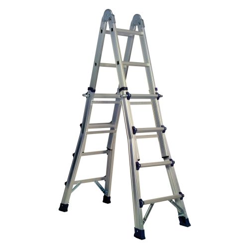 ESCALERA MULTIUSO TODO ALUMINIO. BISAGRA ACERO AUTOMATICA, SISTEMA COMODO, SEGURO Y RAPIDO. 8+8 PELDAÑOS. PERMITE TRABAJOS A DISTINTO NIVEL. MEDIDAS MAXIMAS TIJERA 2,03 MT. UN SOLO TRAMO 4,16 MT. CERTIFICACION EN-131. ROBUSTA Y VERSATIL.