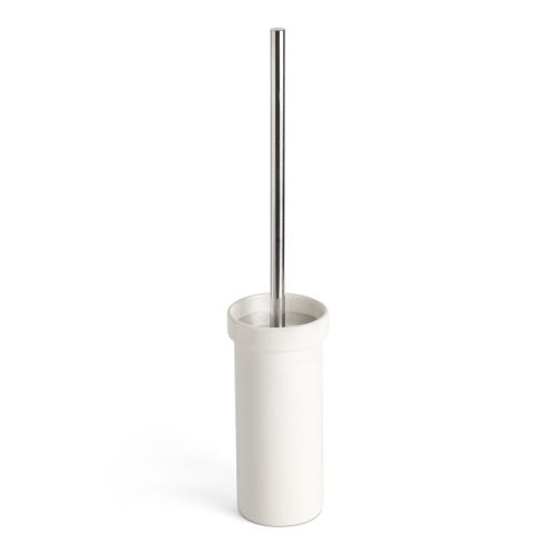 Escobilla WC fabricada en acero inoxidable con recipiento de cerámica blanco.