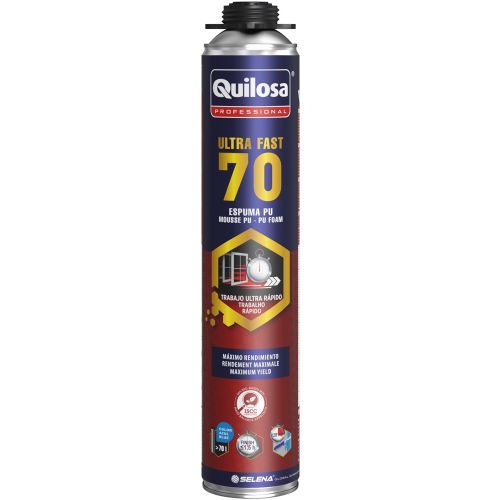Espuma de poliuretano de secado ultra-rápido lista para cortar en 10 min. Comple tamente curada en 90 min. Aislamiento acústico 63 dB. Expansión controlada, evit a deformación de marcos y desperdicio del producto. Alto rendimiento hasta 70 li tros.