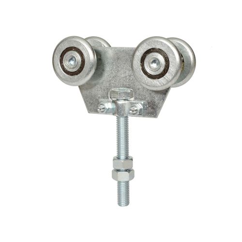 Rollapar doble U-60 metálico. Es un herraje para puertas correderas colgadas que se utiliza para el desplazamiento de las mismas. Este herraje rollapar dispone de 4 ruedas metálicas y va instalado en la parte superior de la puerta, desplazándose por el raíl o guía superior U-60. 4 unidades por caja. Peso: 3,45 kgs. Acabado: Cincado.