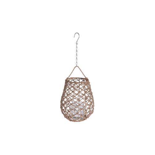 Lampara colgante para velas, ideal para jardín, con tejido de cuerda natural. Ta maño 25 X 29 cm. con cadena de metal y gancho para colgar. Incluye portavelas de vidrio de 10 X 10 cm.
