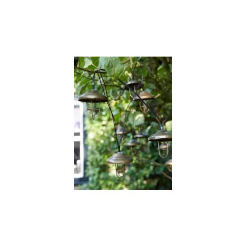 GUIRNALDA SOLAR LANZAROTE 10 Leds. Luz blanca cálida. 3 modos de funcionamiento: ON/OFF/Intermitente. Largo: 3,8m.Color: Bronce Material: Metal Dimensiones: 380 x 5,5 x 5,4 cm (longitud x anchura x altura) Tipo de batería: 1 x NinH AA 600 m Ah 1,2 V (incluida) Con 10 x bombillasLED de tono suave Interruptor de encendido /apagado (On/Off ). Tiempo de iluminación: 6 h