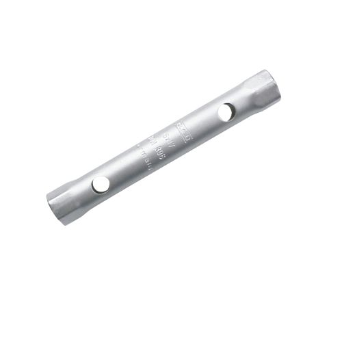 Llave tubular de dos bocas abiertas, fabricada en acero al Cromo-Vanadio, cuerpo es de figura cilíndrica, las bocas son de hexágono (6 caras). El diseño y los procesos de fabricación le dan capacidad de apriete superior a la norma DIN 896 form B, una elasticidad que evita la rotura durante su uso, más segura, larga vi da debido al tratamiento térmico y al tratamiento superficial de cromado. Prese ntación: Cromado satinado mate. Bocas con chaflán para un fácil encaje en la tue rca.