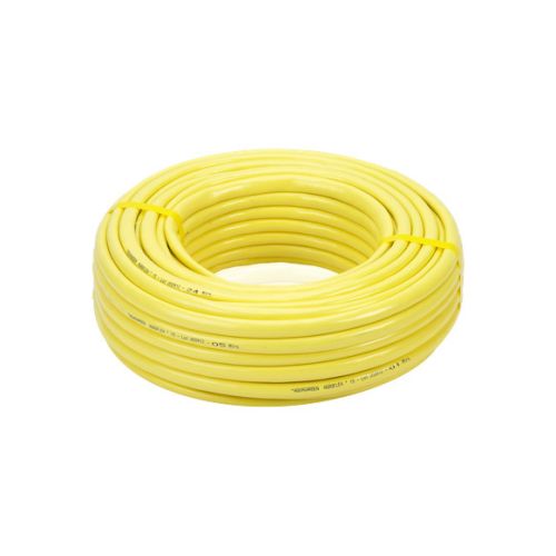 Manguera de PVC plastificada de triple capa, reforzada con hilos de poliéster y tratamiento anti-solar, de gran resistencia a los agentes atmosféricos y al enve jecimiento. Color: Exterior amarillo, interior negro. Ideal para riego por asp ersión, jardinería, construcción y conducción de líquidos a presión. Temperatur a trabajo: -15°C a 60°C. Se presenta en bobinas de 50 / 25 m.