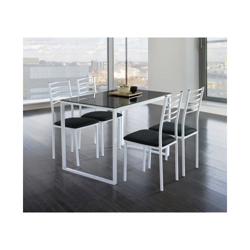 Conjunto de mesa y 4 sillas Su diseño moderno y practico le hace elegante en donde se quiera colocar debido a sus contrastes de color entre el negro y el blanco candidato en cualquier salon o cocina. Medidas: 75 x 110 x 70c. Color negro. Tapa de cristal atamborado de seguridad , estructura en blanco , silla tapizada