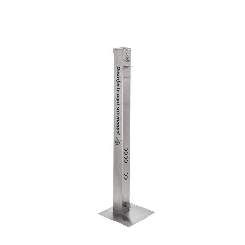 Botella dosificadora de 500ml incluida . Recogedor de goteo de fácil limpieza. Pedal. Material: acero inoxidable Aisi 304 (18/10). Acabado: Pulido. Peso: 5kg. Altura: 1000 mm. Dimensiones de la columna: 70x70 mm. Dimensiones de la base: 250x250 mm. Capacidad de la botella 500 ml