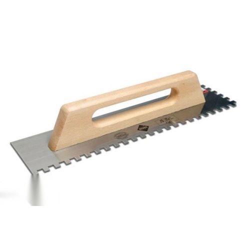 Lámina de acero especial de alta resistencia al desgaste, con protección contra la corrosión mediante barniz incoloro (ACERO).Lámina de acero inoxidable especial de alta resistencia al desgaste (INOX)Perfecta planitud de la lámina.El dentado 20 x 20 mm. ideado para la dosificación de mortero cola en suelos irregulares. Permite un mayor espesor de material de agarre.