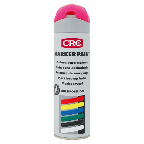 Marcaje en todo tipo de posiciones sin descolgar. CRC Markerpaint esuna pintura especialmente formulada para las labores de señalización ymarcaje de todo tipo d e obras que se realizan al aire libre. Sus pigmentos, de una alta fluorescencia y la formulación única de este producto le hace mantener la misma fluorescencia en fondos claros y en fondos oscuros (asfalto, tierra, etc...) incluso bajo cond iciones ambientales severas (humedad, frío...). Secado rápido. No nocivo. Válvul a 360 ºpara ser aplicado en todo tipo de posiciones. Tapón protector.