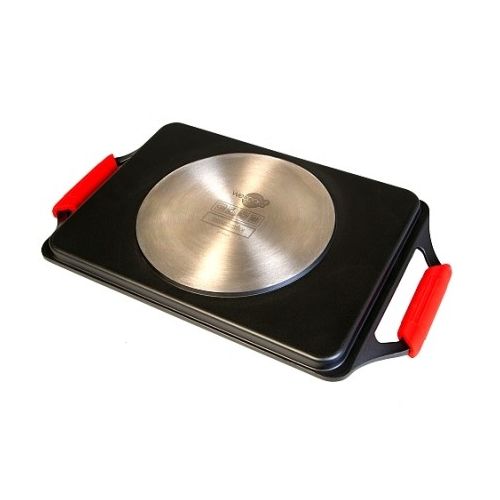 Bandeja asadora de aluminio fundido, máxima robustez. Base de inducción lisa soldada a la pieza, máxima eficiencia y distribución del calor.Antiadherente ecológico libre en PFOA. Apta para todo tipo de cocinas incluida la inducción. Apta para horno. Medidas: 43x25cm.