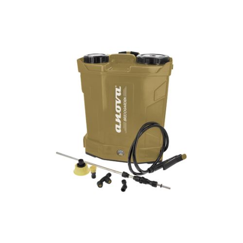 PULVERIZADOR A BATERÍA ANOVA BRICOGARDEN. Capacidad 16 l. Batería de 12 V y 8 Ah . Autonomía de 7 a 10 horas. Caudal ajustable de 1.2 a 2.2 l/min. Presión variab le de 0.15 a 0.4 Mpa. Peso 6.2 kg.