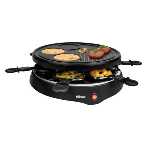 Raclette para 6 personas con placa grill con crepera, potencia 800 W.Superficie de cocinado 29 cm de diámetro. Base antideslizante. Fácil de limpiar.
