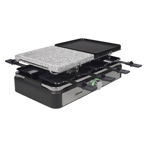 Superficie del gril combinada con piedra natural para una perfecta conservación del calor, placa reversible y 8 mini sartenes. Potencia: 1400 W. Carcasa plástic a de alta calida. Fácil limpieza. Luz piloto. Termostato incluye un anillo de luz para fijar fácilmente la temperatura deseada. Incluye 8 espátulas de madera .