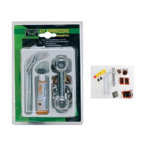 Kit de reparación, incluye: 5 parches : ø25mm (2 unidades), 30x50mm (1 unidad), 35x25mm (2 unidades), pegamento, papel de lija, 2 palancas de neumáticos, llave de tuercas, 2 unidades de válvulas.