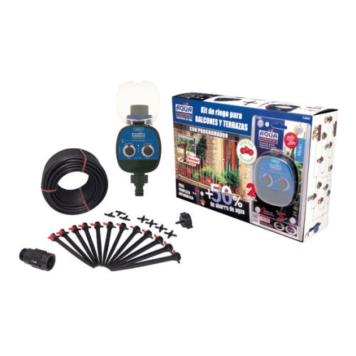 Kit de riego GOTA A GOTA para balcones CONTENIDO: Metros de microtubode 4 mm. 1 adaptador de grifo 3/4 x 4 mm. 1 reductor de presion 3/4 3tes de 4 mm. 4 cruces de 4 mm. 12 gotero Astadrip con estaca. 1 programador de grifo C4099. Para regar huer