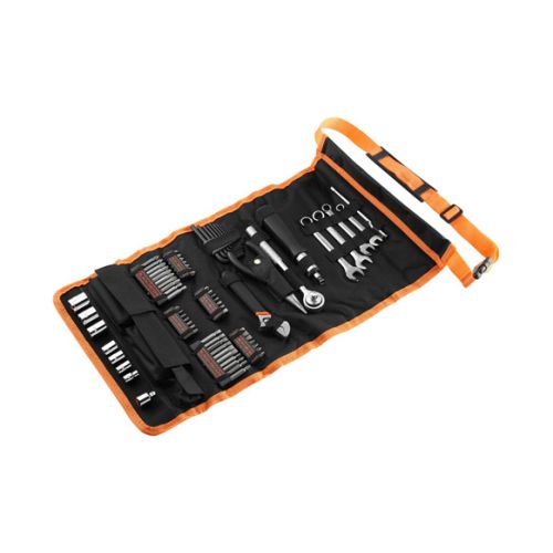 Rollo de nylon con 76 herramientas y accesorios para automóvil y trabajos domést icos compuesto por Llave de Carraca reversible, destornillador porta puntas, pun tas para atornillar de 25mm y 50mm, Llaves de vaso, Llaves allen, Llaves mixtas, Llave ajustable y Alicate de puntas.